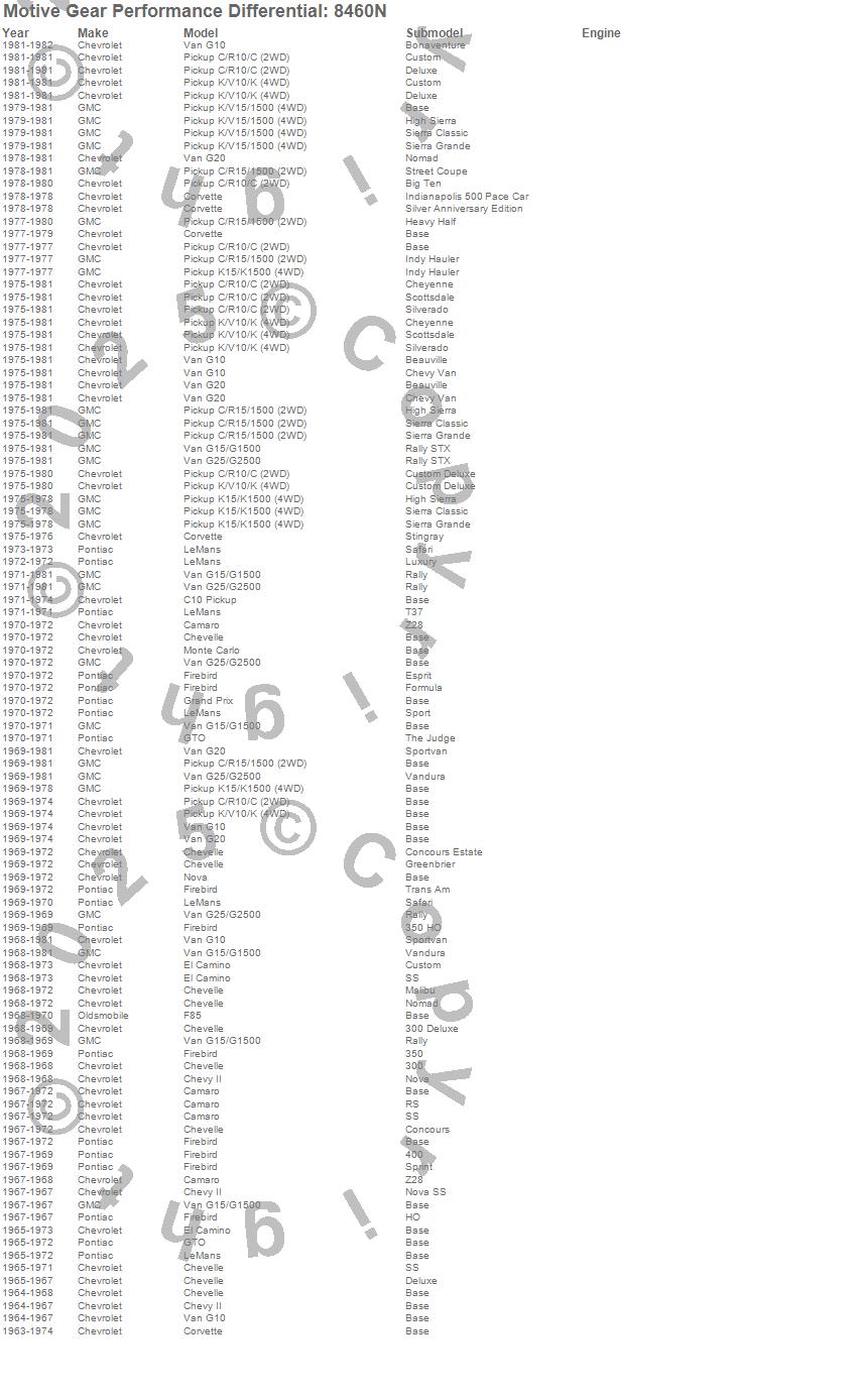 C10 Pickup, C15/C1500, C1500, Camaro, Chevelle, Chevy II, Corvette, El Camino, F85, Firebird, G10 Van, G15/G1500 Van, G20 Van, G25/G2500 Van, Grand Prix, GTO, K10 Pickup, K15/K1500, K1500, LeMans more…