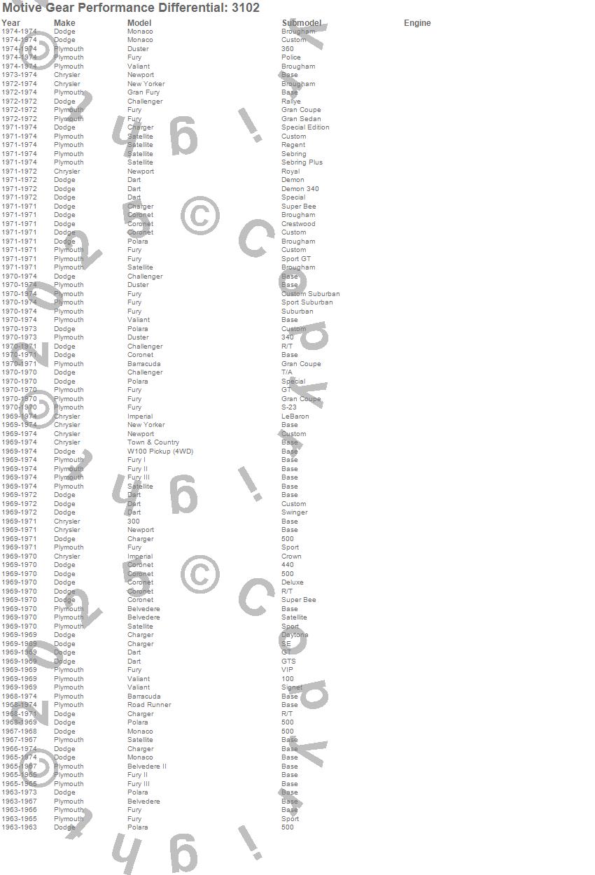 300, Barracuda, Belvedere, Belvedere II, Challenger, Charger, Coronet, Dart, Duster, Fury, Fury I, Fury II, Fury III, Gran Fury, Imperial, Monaco, New Yorker, Newport, Polara, Road Runner more…
