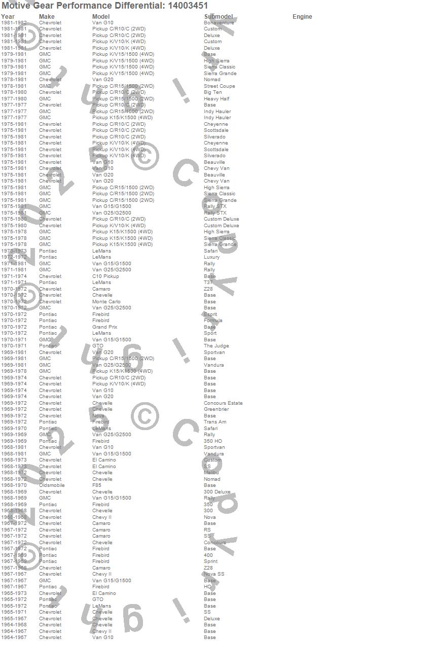 C10 Pickup, C15/C1500, C1500, Camaro, Chevelle, Chevy II, El Camino, F85, Firebird, G10 Van, G15/G1500 Van, G20 Van, G25/G2500 Van, Grand Prix, GTO, K10 Pickup, K15/K1500, K1500, LeMans, Monte Carlo more…