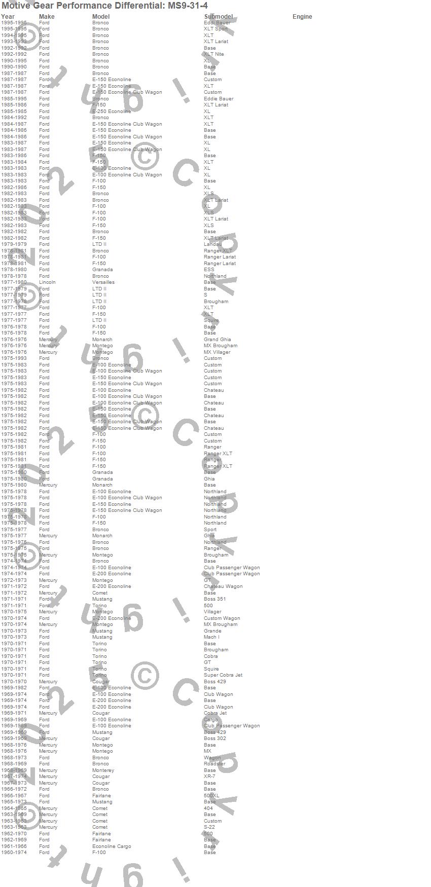 Bronco, Comet, Cougar, E-100 Econoline, E-100 Econoline Club Wagon, E-150 Econoline, E-150 Econoline Club Wagon, E-200 Econoline, Econoline Cargo, F-100, F-150, Fairlane, Granada, LTD II, Monarch, Montego, Mustang, Torino, Versailles, Ford more…
