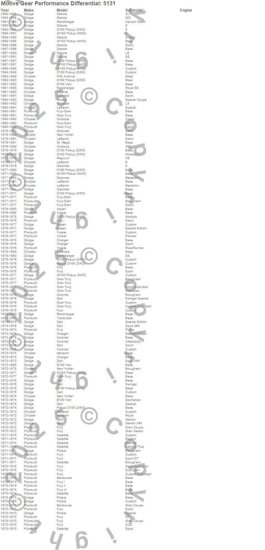 Aspen, B100 Van, B150, B150 Van, Barracuda, Charger, Cordoba, Coronet, D100 Pickup, D150 Pickup, Dakota, Dart, Diplomat, Fifth Avenue, Fury, Fury I, Fury II, Fury III, Gran Fury, Imperial more…