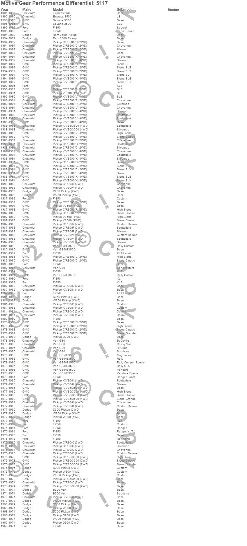 C30 Pickup, C35/C3500 Pickup, C3500 Pickup, D250 Pickup, D300 Pickup, D350 Pickup, Express 3500, F-350, G30, G30 Van, G35/G3500 Van, K30 Pickup, K35 Pickup, K35/K3500 Pickup, K3500 Pickup, R30 Pickup, R3500 Pickup, Ram 2500, Ram 3500, Savana 3500 more…