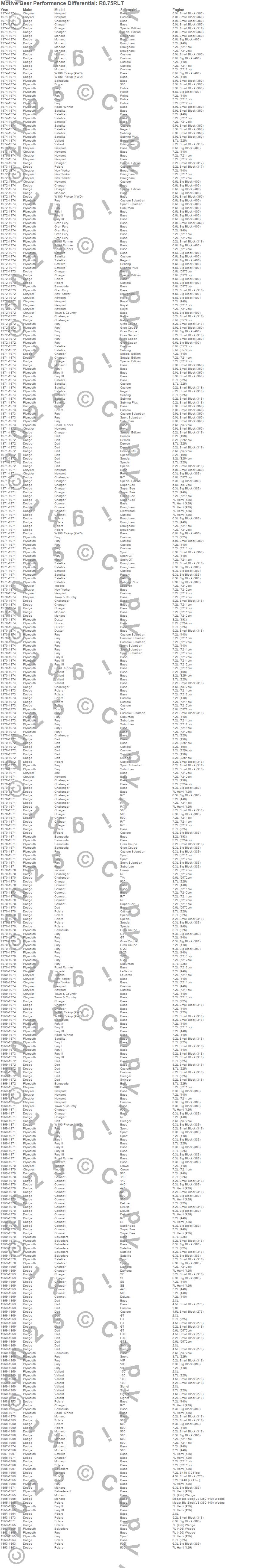 300, Barracuda, Belvedere, Belvedere II, Challenger, Charger, Coronet, Dart, Duster, Fury, Fury I, Fury II, Fury III, Gran Fury, Imperial, Monaco, New Yorker, Newport, Polara, Road Runner more…