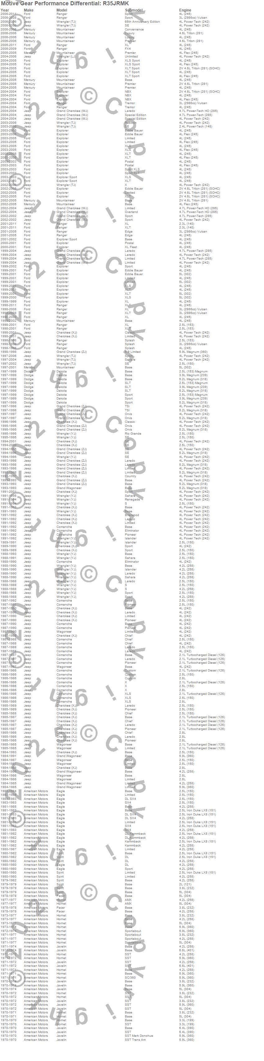 Cherokee (XJ), Comanche, Dakota, Eagle, Explorer, Grand Cherokee (WJ), Grand Cherokee (ZJ), Grand Wagoneer, Hornet, Javelin, Mountaineer, Pacer, Ranger, Spirit, Wagoneer, Wrangler (LJ), Wrangler (TJ), Wrangler (YJ), American Motors, Dodge more…
