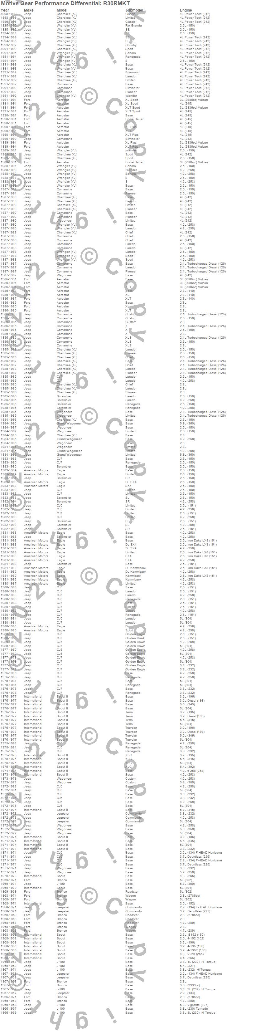 Aerostar, Bronco, Cherokee (XJ), CJ5, CJ6, CJ7, Comanche, Eagle, Grand Wagoneer, J-100, Jeepster, Scout, Scout II, Scrambler, Wagoneer, Wrangler (YJ), American Motors, Ford, International, Jeep more…