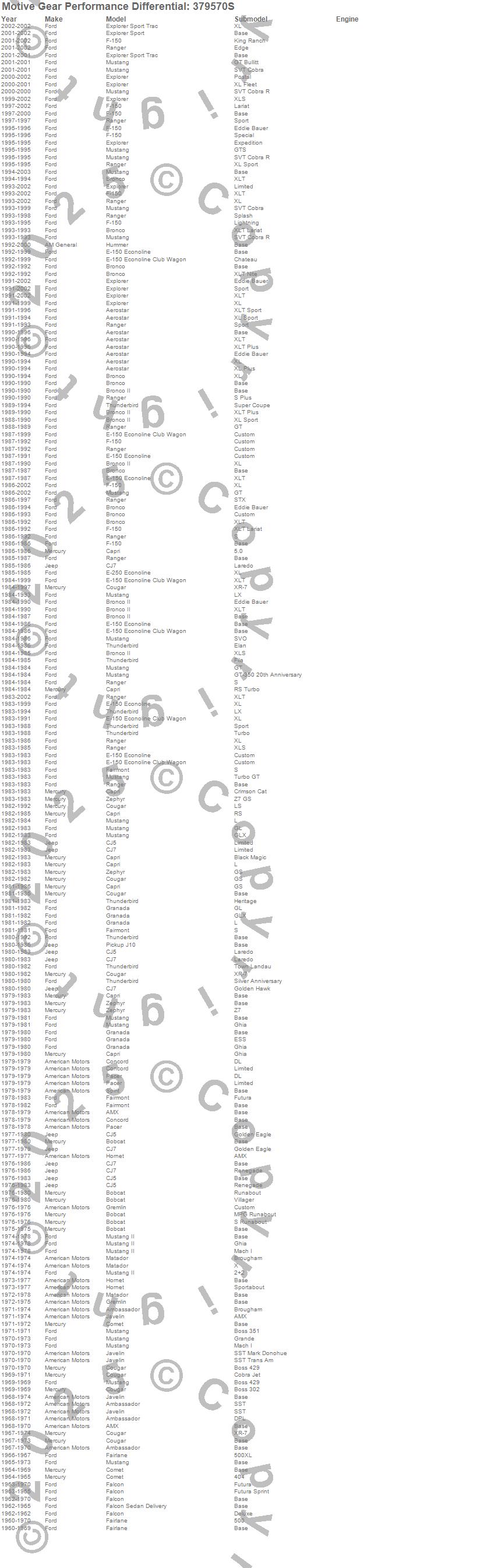 Aerostar, Ambassador, AMX, Bobcat, Bronco, Bronco II, Capri, CJ5, CJ7, Comet, Concord, Cougar, E-150 Econoline, E-150 Econoline Club Wagon, Explorer, Explorer Sport Trac, F-150, Fairlane, Fairmont, Falcon more…