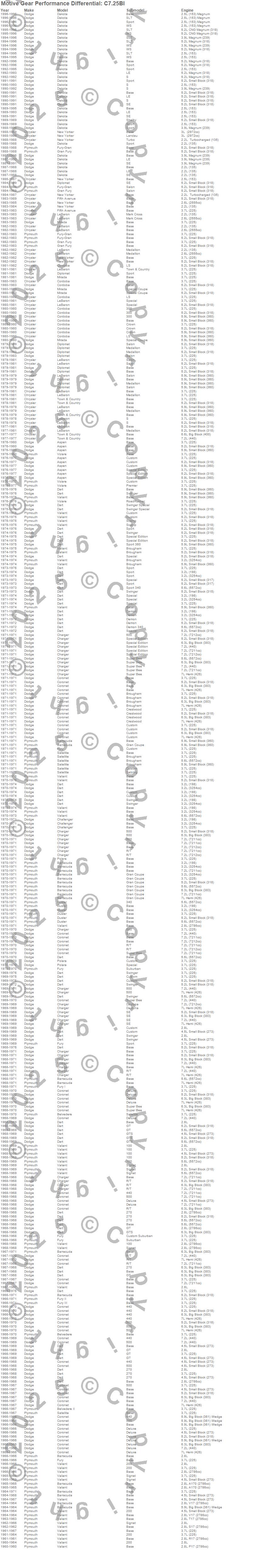 Aspen, Barracuda, Belvedere, Belvedere II, Challenger, Charger, Cordoba, Coronet, Dakota, Dart, Diplomat, Duster, Fifth Avenue, Fury, Fury I, Fury II, Fury III, Gran Fury, LeBaron, Mirada more…