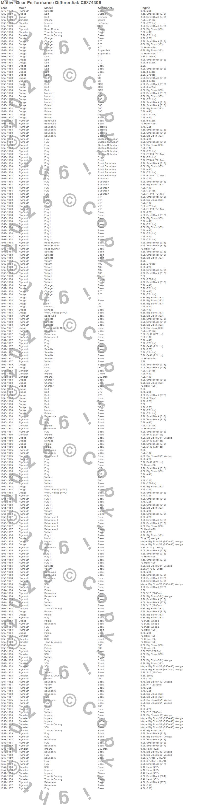 300, Barracuda, Belvedere, Belvedere II, Charger, Coronet, Dart, Fury, Fury I, Fury II, Fury III, Imperial, Monaco, Polara, Road Runner, Satellite, Town & Country, Valiant, W100 Pickup, W300 Series more…