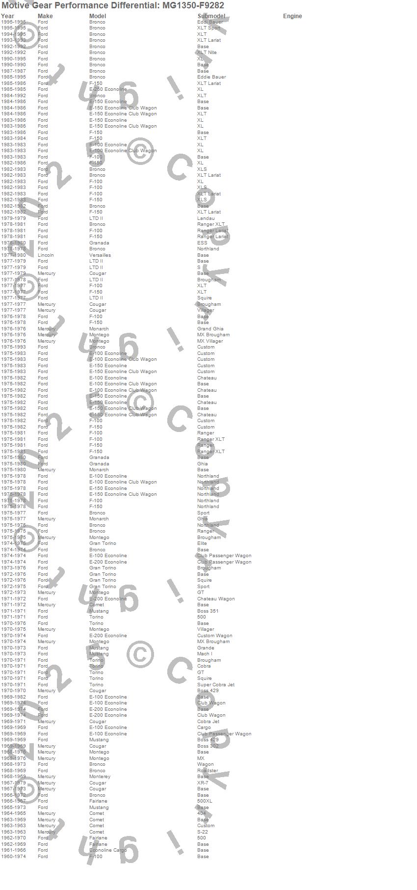 Bronco, Comet, Cougar, E-100 Econoline, E-100 Econoline Club Wagon, E-150 Econoline, E-150 Econoline Club Wagon, E-200 Econoline, Econoline Cargo, F-100, F-150, Fairlane, Gran Torino, Granada, LTD II, Monarch, Montego, Mustang, Torino, Versailles more…