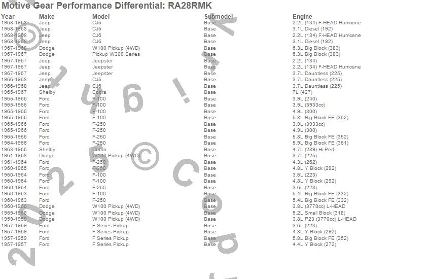 Below is an abreviated list of applications for the Master Bearing Kit.