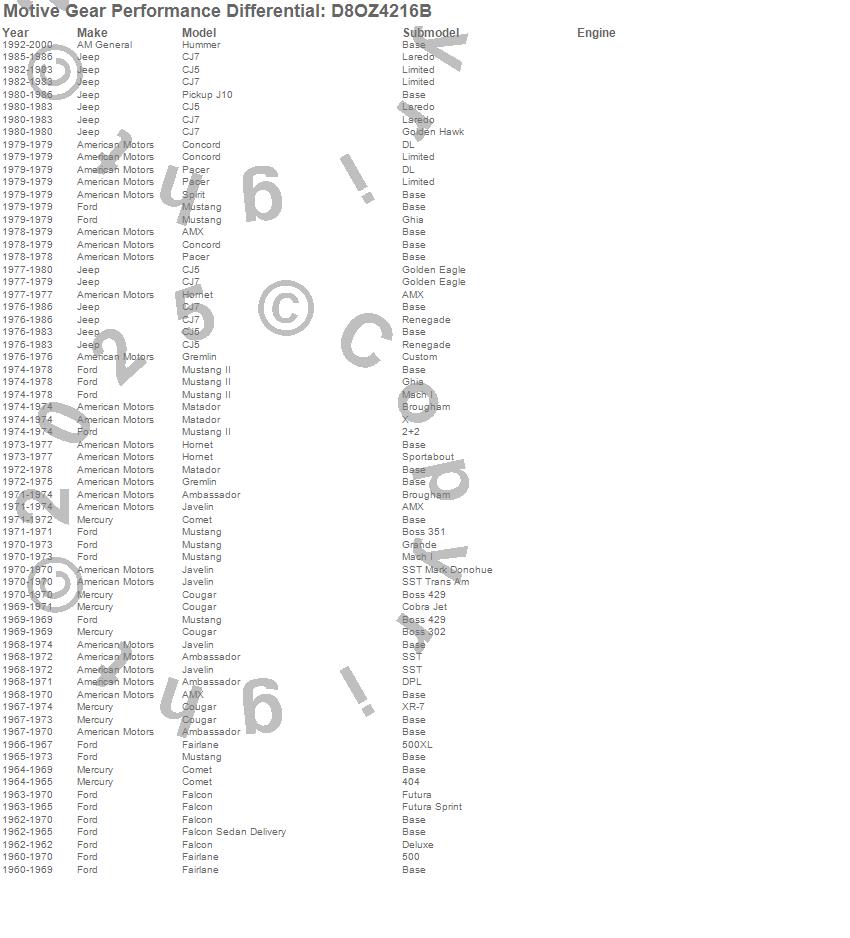 Ambassador, AMX, CJ5, CJ7, Comet, Concord, Cougar, Fairlane, Falcon, Falcon Sedan Delivery, Gremlin, Hornet, Hummer, J10, Javelin, Matador, Mustang, Mustang II, Pacer, Spirit more…