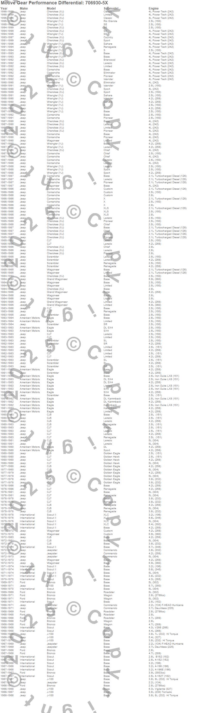 Bronco, Cherokee (XJ), CJ5, CJ7, Comanche, Eagle, Grand Wagoneer, J-100, Jeepster, Scout, Scout II, Scrambler, Wagoneer, Wrangler (YJ), American Motors, Ford, International, Jeep, 1999, 1998 more…