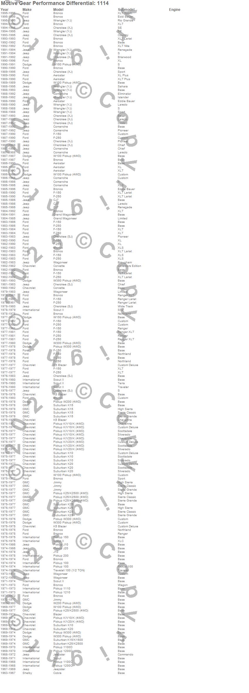 200 Pickup, Aerostar, Blazer, Blazer K5, Bronco, Cherokee (SJ), Cherokee (XJ), CJ7, Cobra, Comanche, Corvette, F-150, F-250, Grand Wagoneer, J10, J20, Jeepster, Jimmy, K10 Pickup, K10 Suburban more…