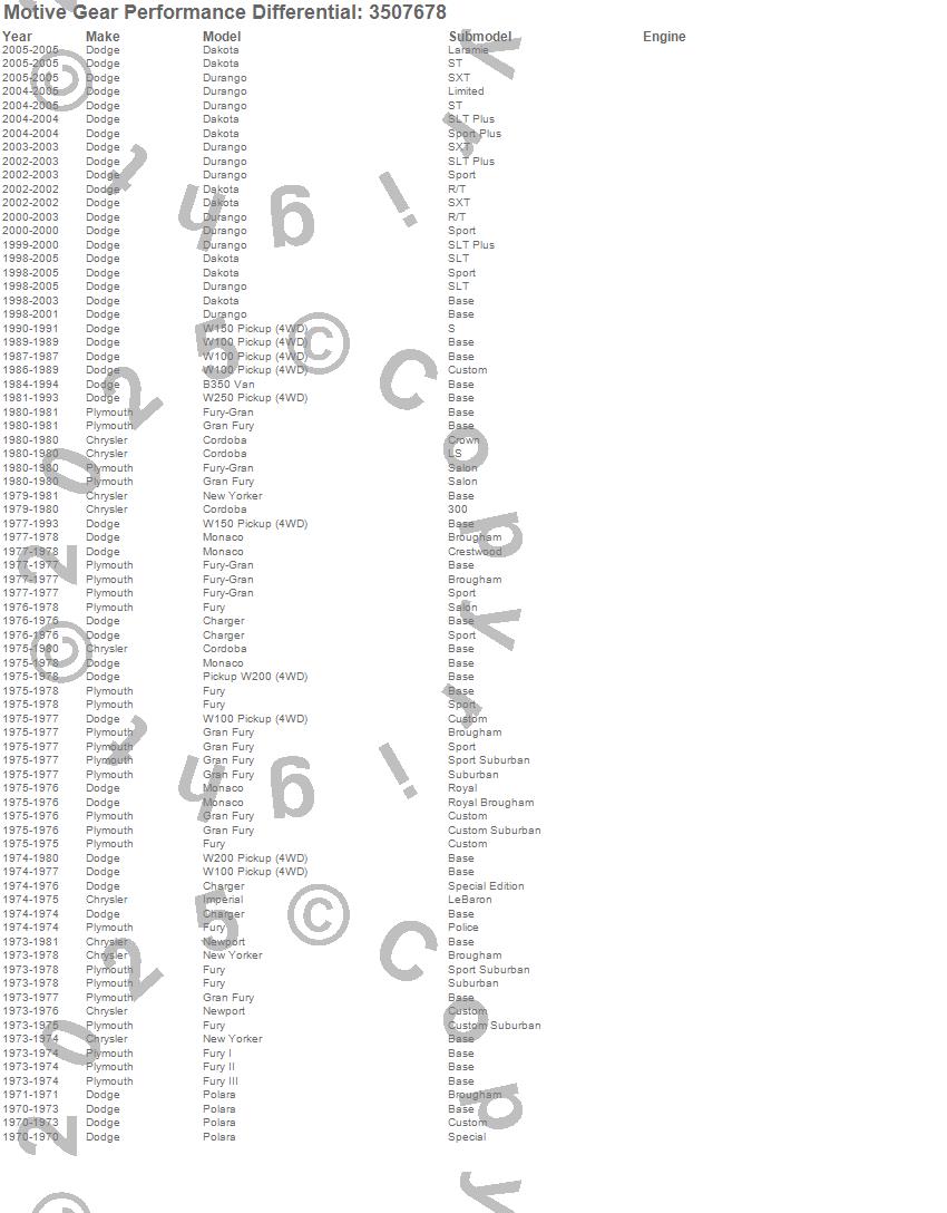 B350, B350 Van, Charger, Cordoba, Dakota, Durango, Fury, Fury I, Fury II, Fury III, Gran Fury, Imperial, Monaco, New Yorker, Newport, Polara, W100 Pickup, W150 Pickup, W200 Pickup, W250 Pickup more…