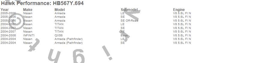 Below is an abreviated list of applications for the Disc Brake Pad. Armada, Pathfinder, QX56, Titan, Infiniti, Nissan, 2007, 2006, 2005, 2004 more…