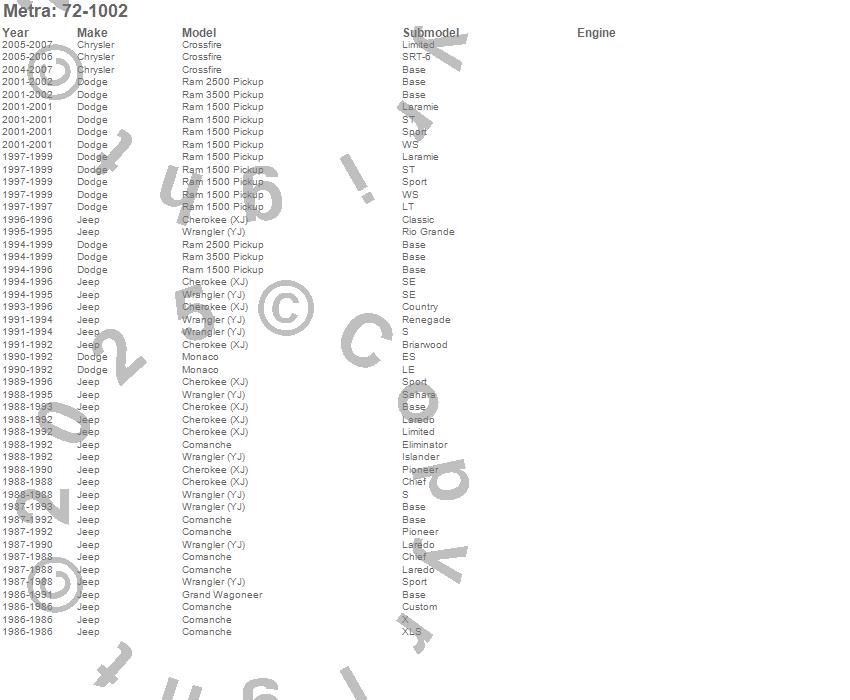 Cherokee (XJ), Comanche, Crossfire, Grand Wagoneer, Monaco, Ram 1500, Ram 2500, Ram 3500, Wrangler (YJ), Chrysler, Dodge, Jeep, 2007, 2006, 2005, 2004, 2002, 2001, 1999, 1998 more…
