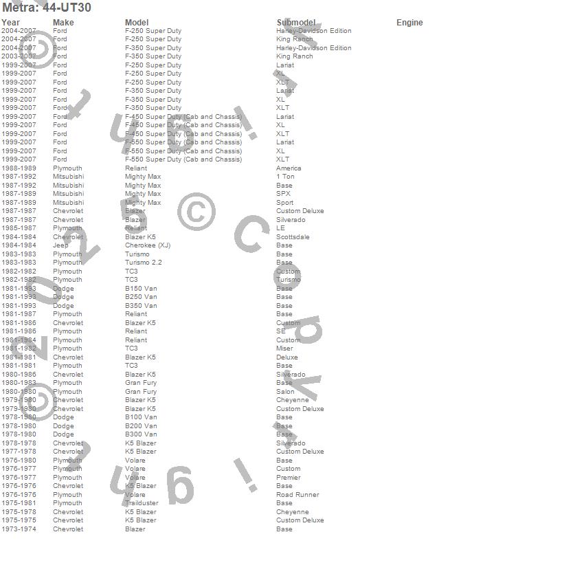 B100 Van, B150, B150 Van, B200 Van, B250, B250 Van, B300 Van, B350, B350 Van, Blazer, Blazer K5, Cherokee (XJ), F-250 Super Duty, F-350 Super Duty, F-450 Super Duty, F-550 Super Duty, Gran Fury, Horizon, Mighty Max, Reliant more…