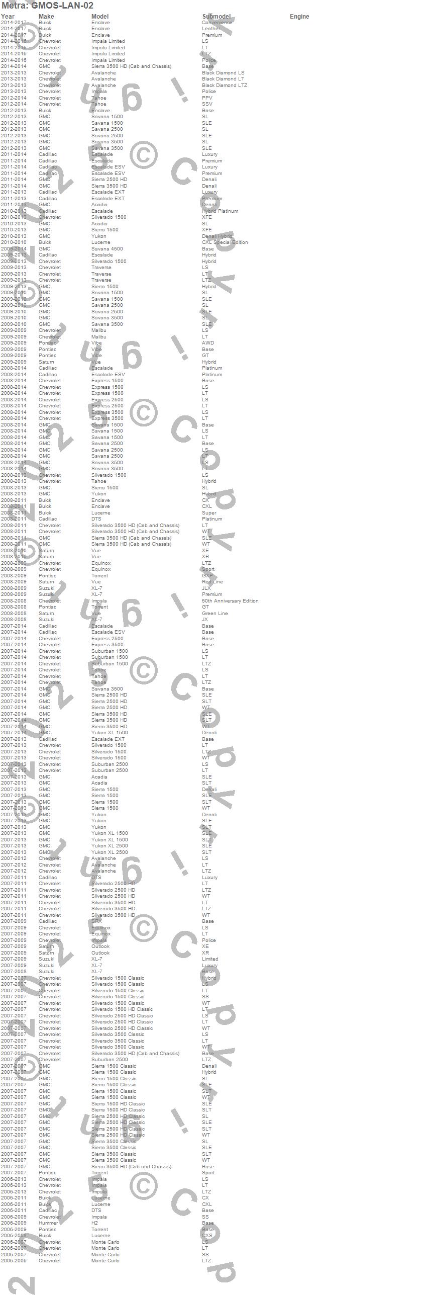Acadia, Avalanche, DTS, Enclave, Equinox, Escalade, Escalade ESV, Escalade EXT, Express 1500, Express 2500, Express 3500, H2, Impala, Lucerne, Malibu, Monte Carlo, Outlook, Savana 1500, Savana 2500, Savana 3500 more…