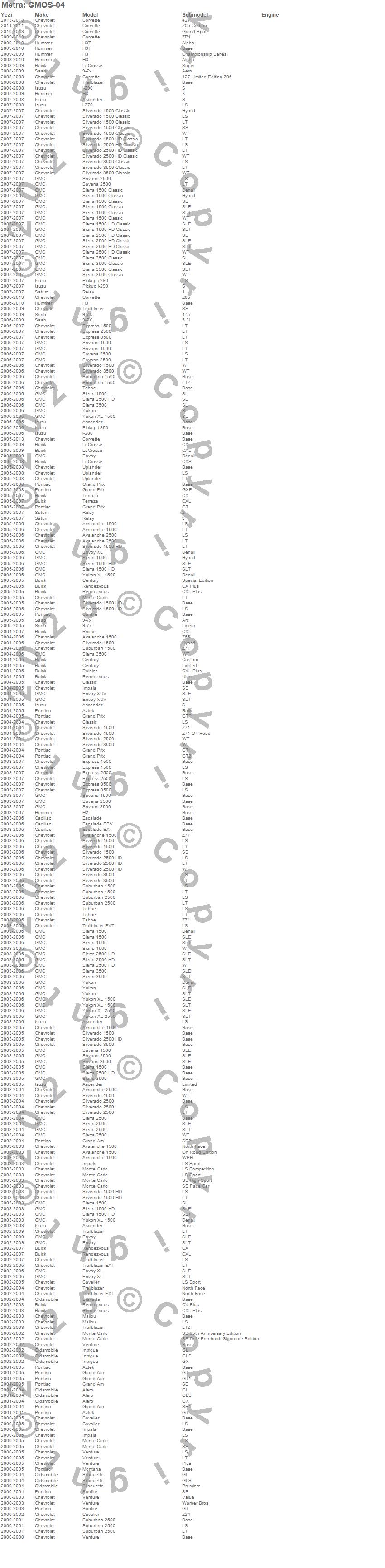 9-7X, Alero, Ascender, Avalanche 1500, Avalanche 2500, Aztek, Bravada, Cavalier, Century, Classic, Corvette, Envoy, Envoy XL, Envoy XUV, Escalade, Escalade ESV, Escalade EXT, Express 1500, Express 2500, Express 3500 more…