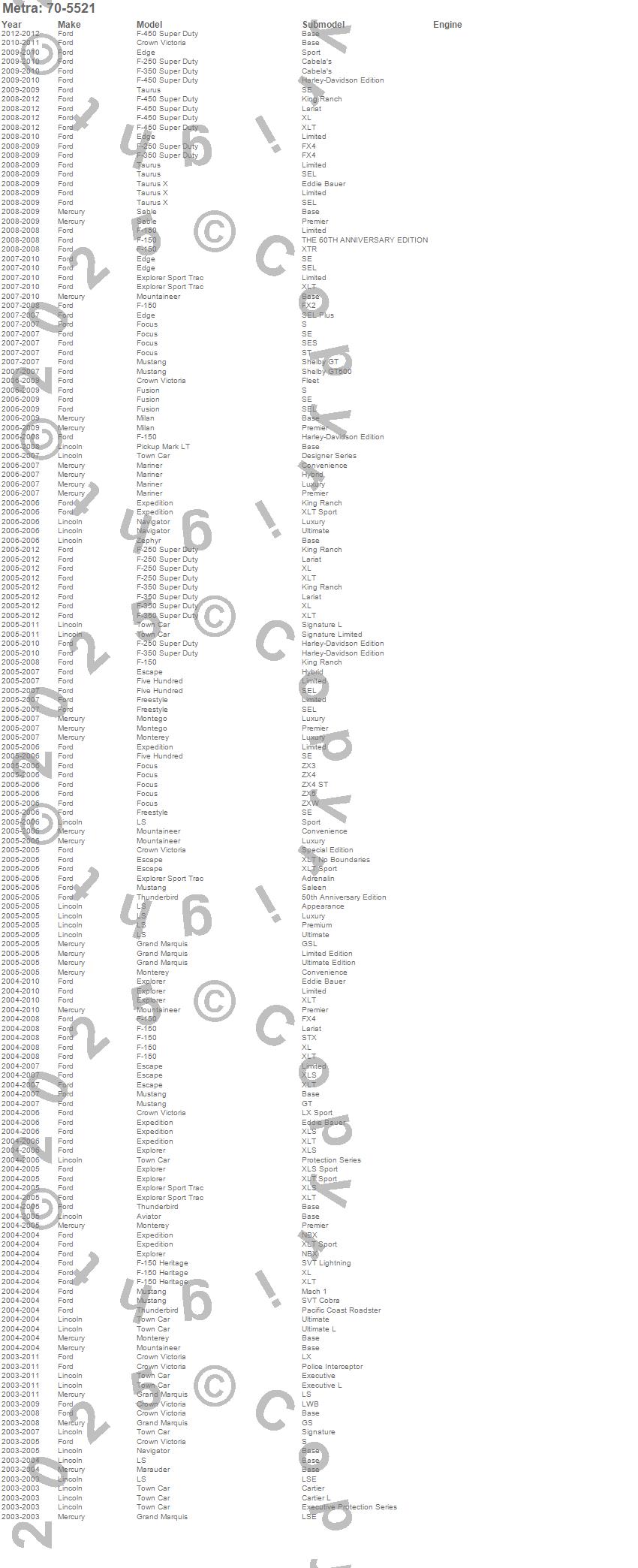 Aviator, Crown Victoria, E-150 Econoline, E-250 Econoline, Escape, Expedition, Explorer, Explorer Sport Trac, F-150, F-250 Super Duty, F-350 Super Duty, F-450 Super Duty, F-550 Super Duty, Five Hundred, Focus, Freestyle, Fusion, Grand Marquis, GT, LS more…