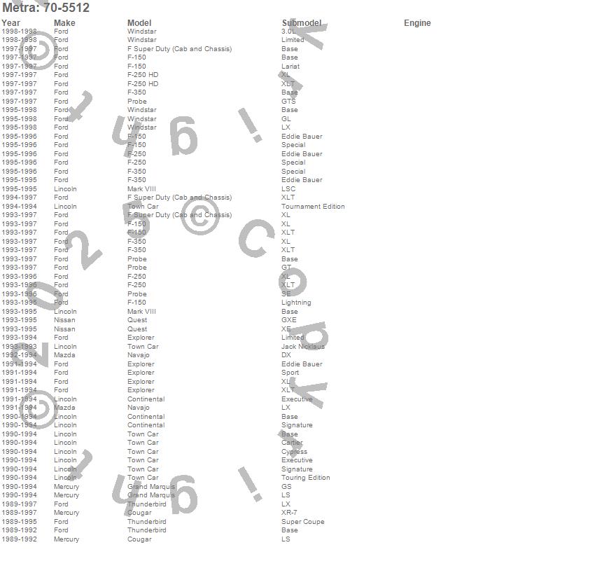 Continental, Cougar, Explorer, F Super Duty, F-150, F-250, F-350, Grand Marquis, Mark VIII, Navajo, Probe, Quest, Thunderbird, Town Car, Windstar, Ford, Lincoln, Mazda, Mercury, Nissan more…
