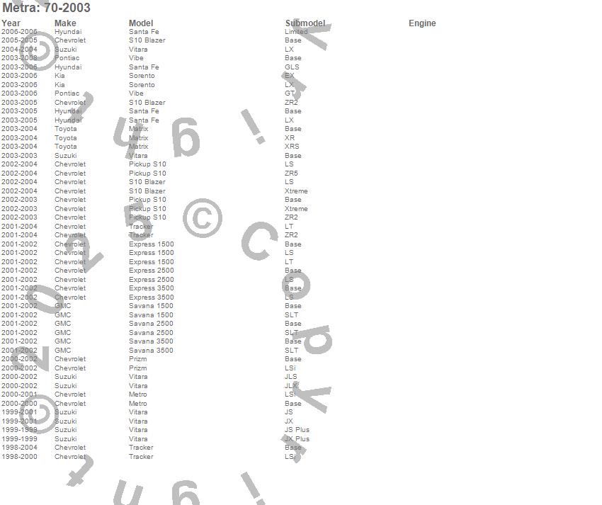 Express 1500, Express 2500, Express 3500, Matrix, Metro, Prizm, S10 Blazer, S10 Pickup, Santa Fe, Savana 1500, Savana 2500, Savana 3500, Sorento, Tracker, Vibe, Vitara, Chevrolet, GMC, Hyundai, Kia more…