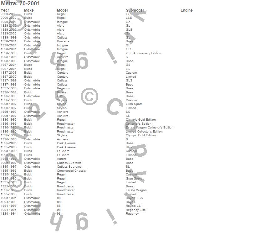 88, 98, Achieva, Alero, Aurora, Bravada, Century, Commercial Chassis, Cutlass, Cutlass Supreme, Intrigue, LeSabre, LSS, Park Avenue, Regal, Regency, Riviera, Roadmaster, Skylark, Buick more…