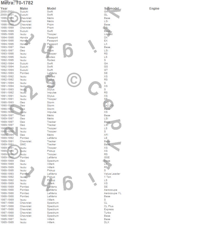 Amigo, I-Mark, Impulse, LeMans, Metro, Passport, Pickup, Prizm, Rodeo, Spectrum, Storm, Stylus, Swift, Tracker, Trooper, Trooper II, Chevrolet, Geo, Honda, Isuzu more…