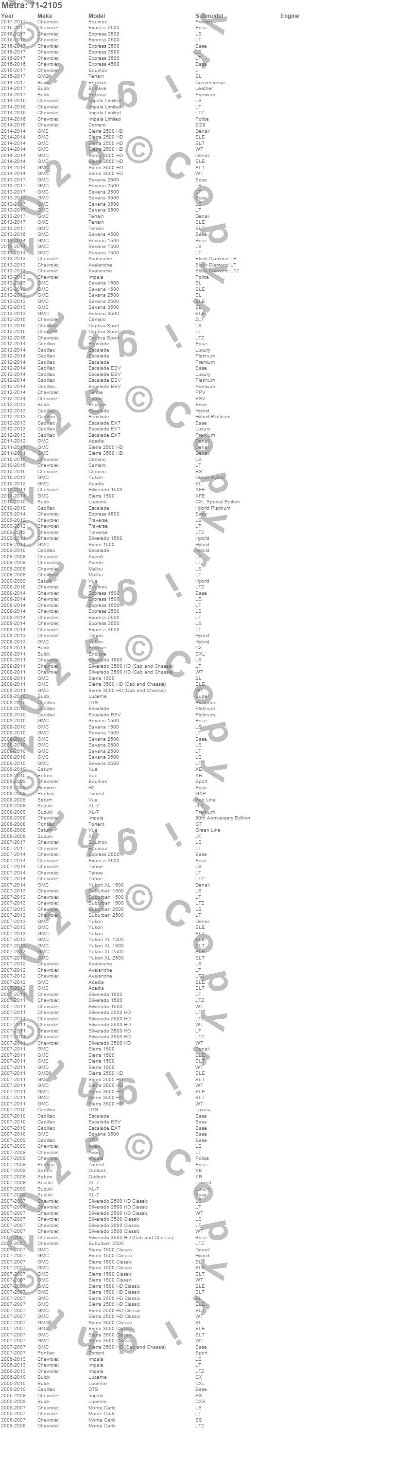 Acadia, Avalanche, Aveo, Aveo5, DTS, Enclave, Equinox, Escalade, Escalade ESV, Escalade EXT, Express 1500, Express 2500, Express 3500, H2, Impala, Lucerne, Malibu, Monte Carlo, Outlook, Savana 1500 more…