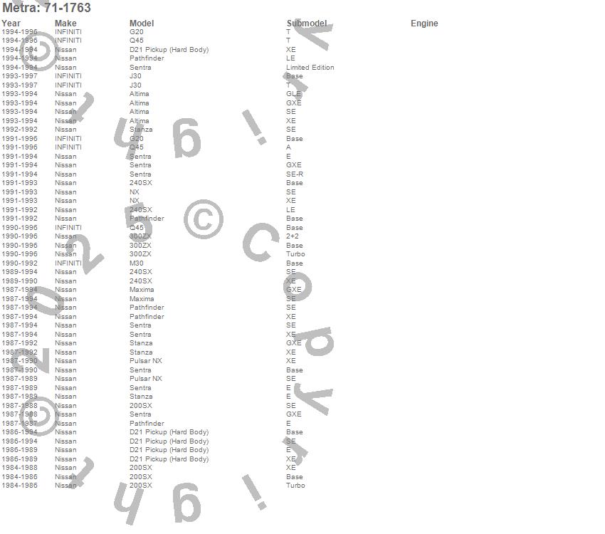 200SX, 240SX, 300ZX, Altima, D21 Pickup (Hard Body), G20, J30, M30, Maxima, NX, Pathfinder, Pulsar NX, Q45, Sentra, Stanza, Infiniti, Nissan, 1997, 1996, 1995 more…