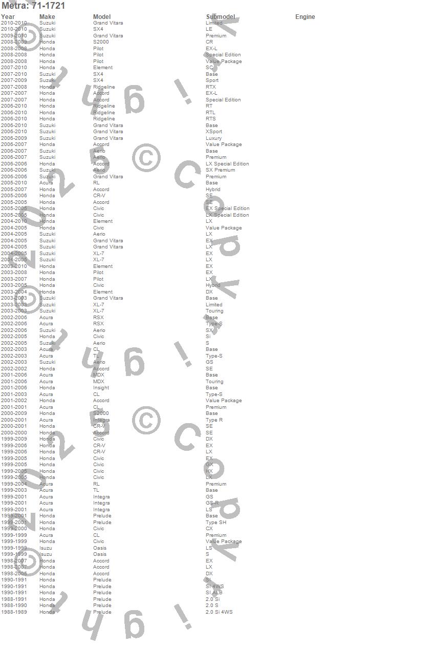 Accord, Aerio, Civic, CL, CR-V, Element, Grand Vitara, Insight, Integra, MDX, Oasis, Pilot, Prelude, Ridgeline, RL, RSX, S2000, SX4, TL, XL-7 more…