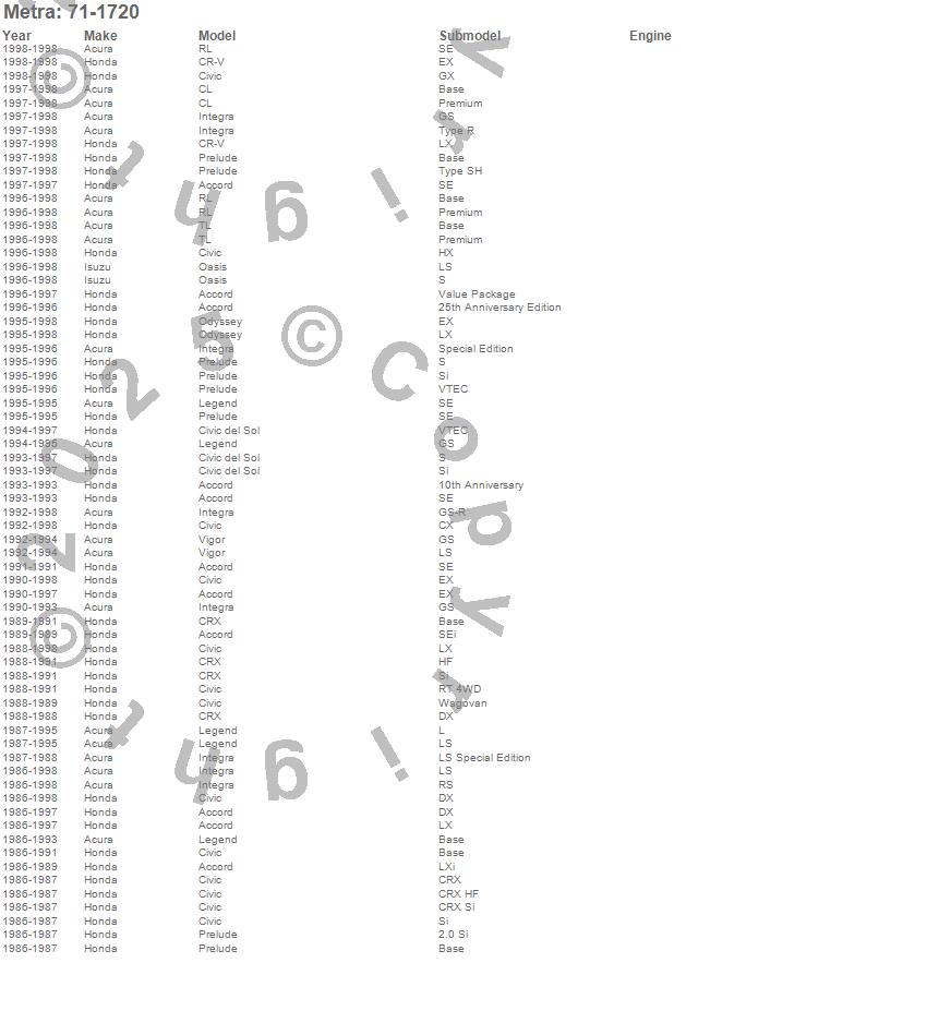 Accord, Civic, Civic del Sol, CL, CR-V, CRX, Integra, Legend, Oasis, Odyssey, Prelude, RL, TL, Vigor, Acura, Honda, Isuzu, 1998, 1997, 1996 more…