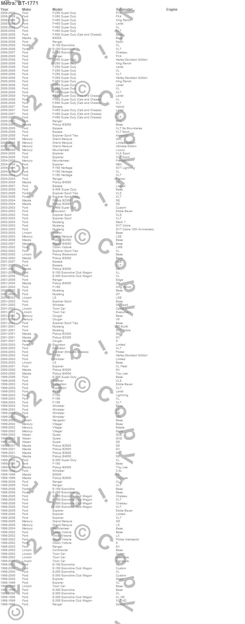 Aviator, B2300, B2500, B3000, B4000, Blackwood, Continental, Cougar, Crown Victoria, E-150 Econoline, E-150 Econoline Club Wagon, E-250 Econoline, E-250 Super Duty, E-350 Econoline, E-350 Econoline Club Wagon, E-350 Super Duty, E-450 Super Duty, E-450 Super Duty Stripped Chassis, Escape, Excursion more…