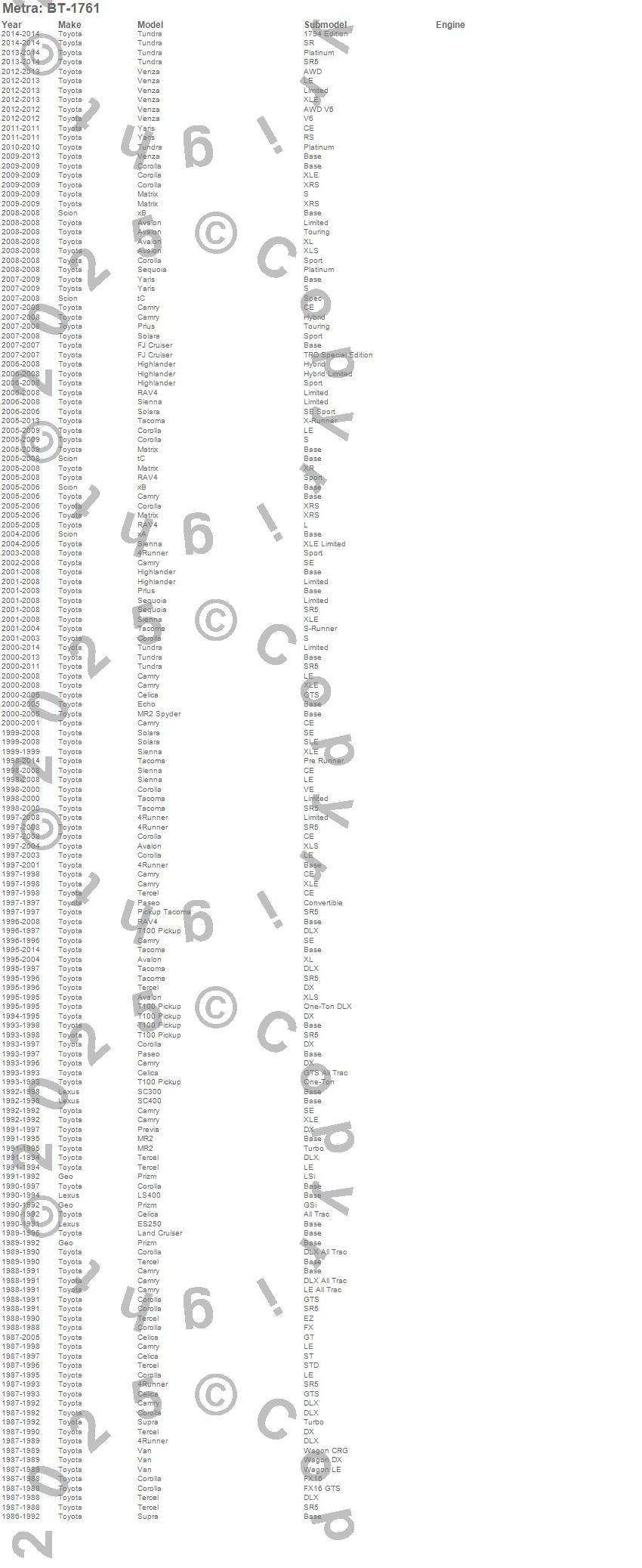 4Runner, Avalon, Camry, Celica, Corolla, Echo, ES250, FJ Cruiser, Highlander, Land Cruiser, LS400, Matrix, MR2, MR2 Spyder, Paseo, Previa, Prius, Prizm, RAV4, SC300 more…