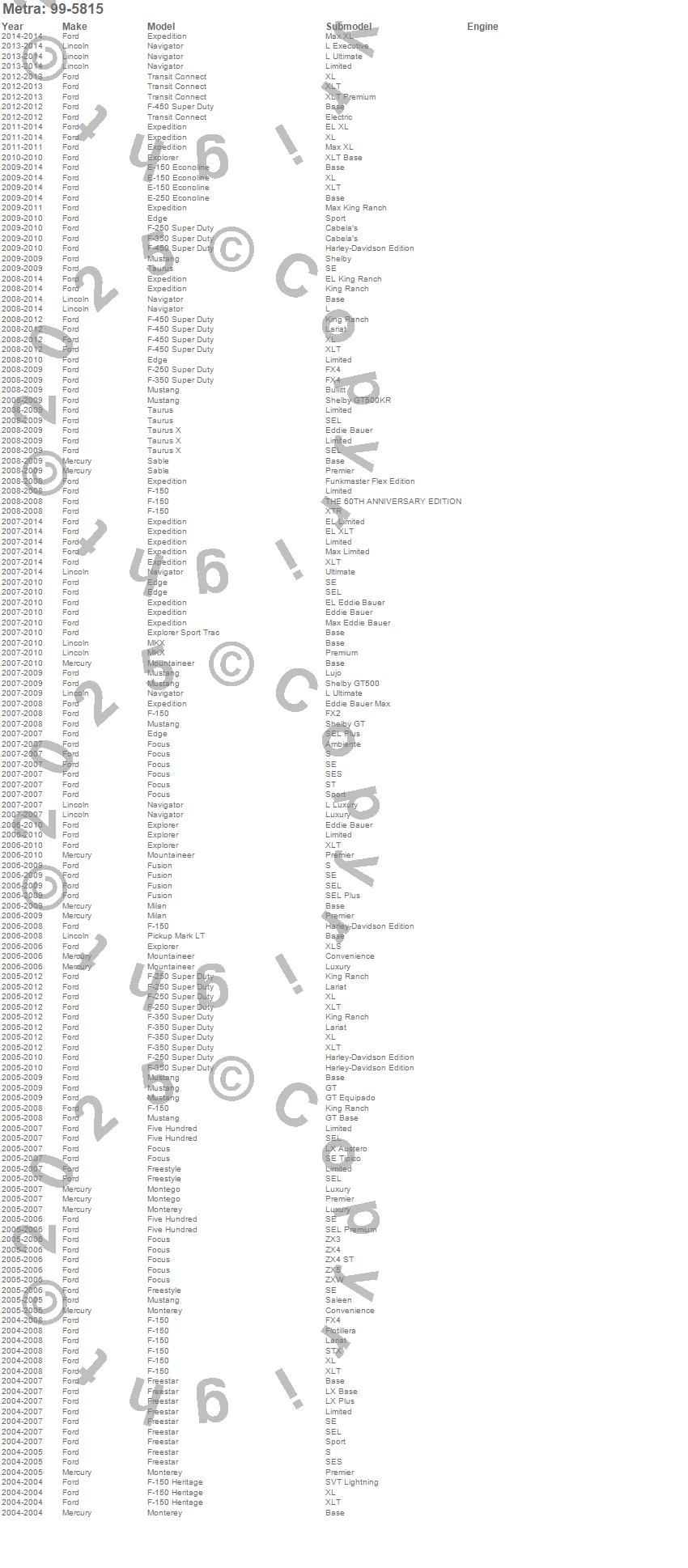 Aviator, Crown Victoria, E-150 Econoline, E-150 Econoline Club Wagon, E-250 Econoline, E-250 Super Duty, E-350 Econoline Club Wagon, E-350 Super Duty, E-450 Super Duty, Edge, Escape, Excursion, Expedition, Explorer, Explorer Sport Trac, F-150, F-150 Heritage, F-250 Super Duty, F-350 Super Duty, F-450 Super Duty more…