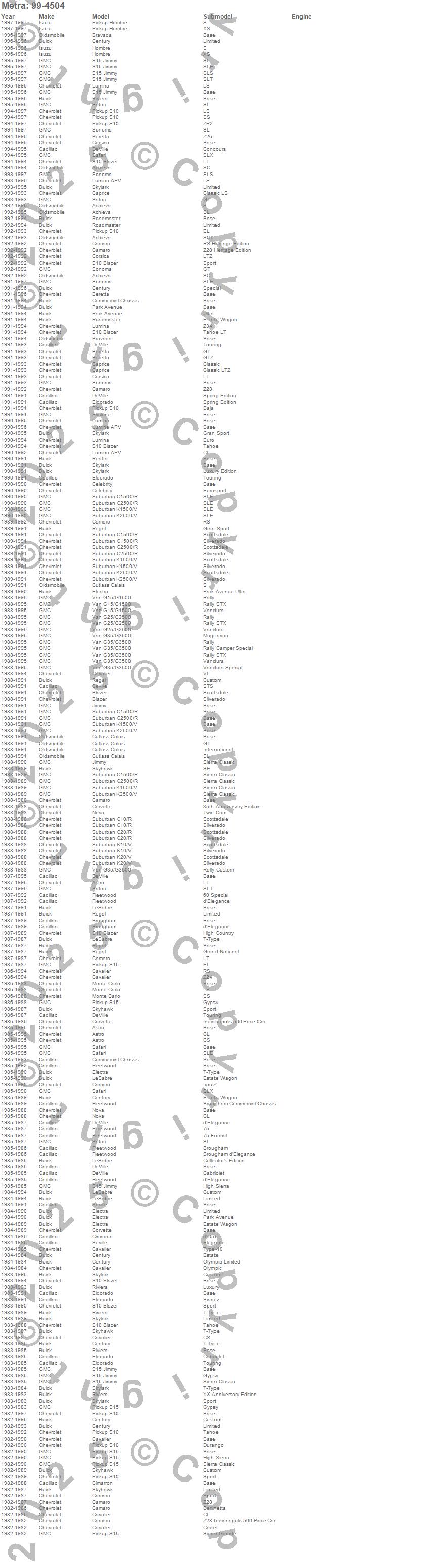Achieva, Astro, Beretta, Blazer, Bravada, Brougham, Camaro, Caprice, Cavalier, Celebrity, Century, Cimarron, Commercial Chassis, Corsica, Corvette, Cutlass Calais, DeVille, Eldorado, Electra, Fleetwood more…