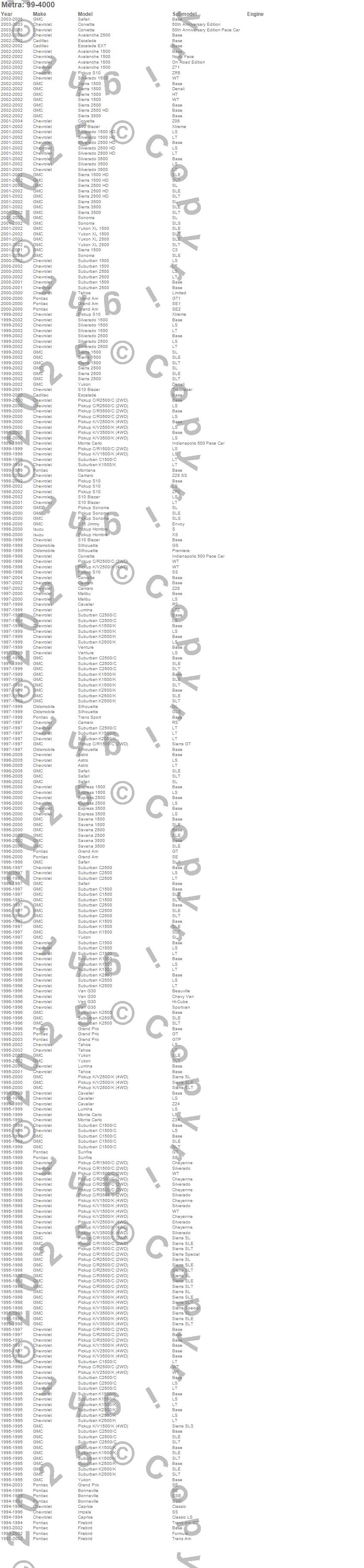 Astro, Avalanche 1500, Avalanche 2500, Bonneville, C1500 Pickup, C1500 Suburban, C2500 Pickup, C2500 Suburban, C3500 Pickup, Camaro, Caprice, Cavalier, Corvette, Escalade, Escalade EXT, Express 1500, Express 2500, Express 3500, Firebird, G30 more…