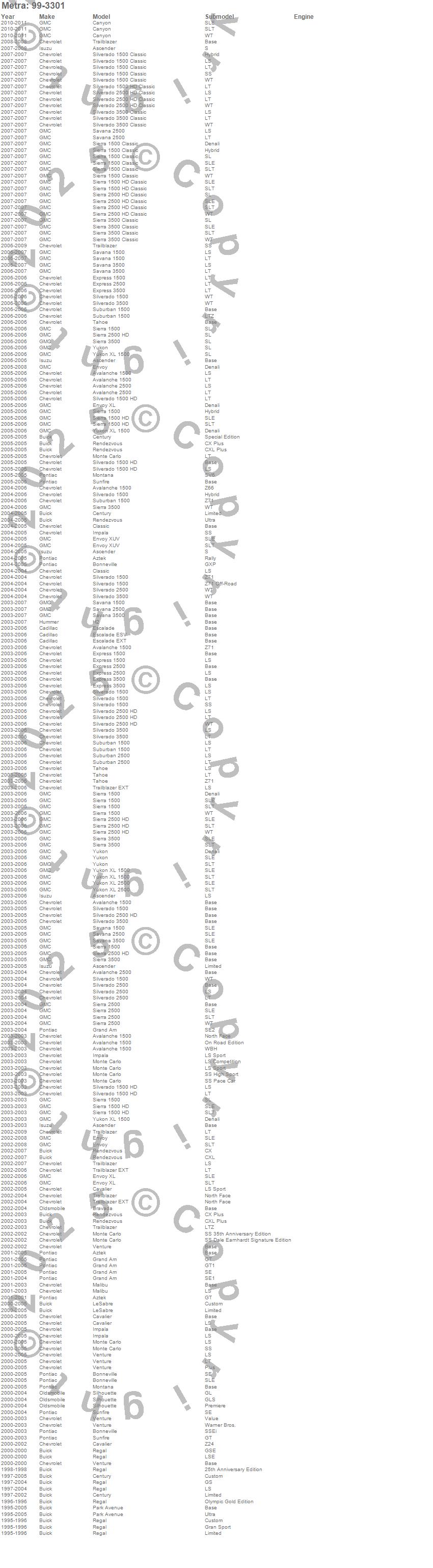 Ascender, Avalanche 1500, Avalanche 2500, Aztek, Bonneville, Bravada, Canyon, Cavalier, Century, Classic, Envoy, Envoy XL, Envoy XUV, Escalade, Escalade ESV, Escalade EXT, Express 1500, Express 2500, Express 3500, Grand Am more…