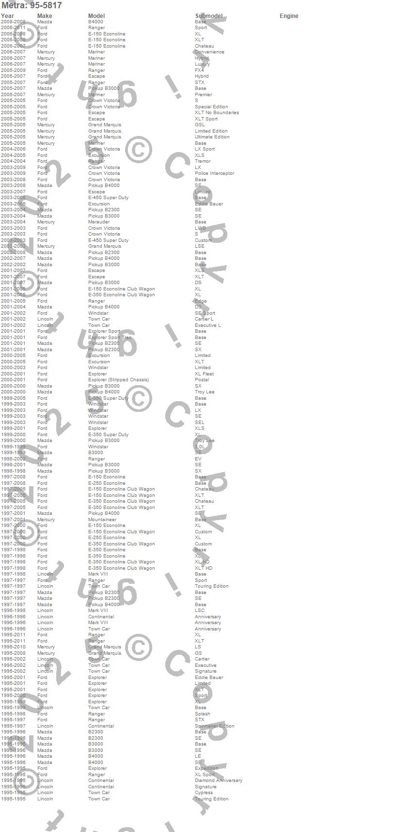 B2300, B3000, B4000, Continental, Crown Victoria, E-150 Econoline, E-150 Econoline Club Wagon, E-250 Econoline, E-250 Super Duty, E-350 Econoline, E-350 Econoline Club Wagon, E-350 Super Duty, E-450 Super Duty, E-450 Super Duty Stripped Chassis, Escape, Excursion, Explorer, Explorer Sport Trac, Grand Marquis, Marauder more…