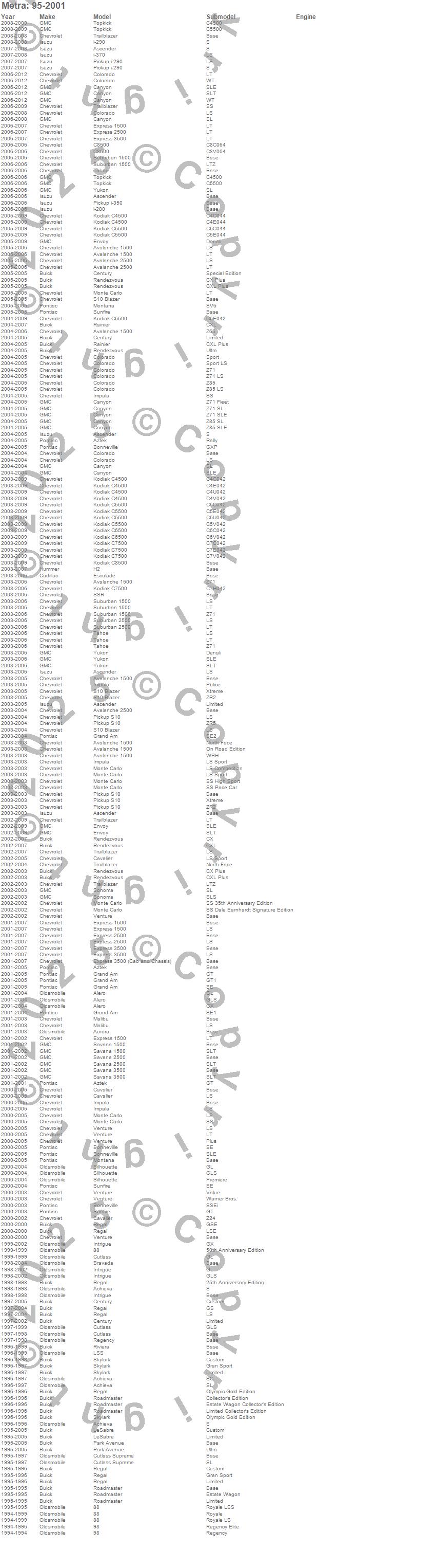 88, Acadia, Alero, Astra, Astro, Aura, Aurora, Avalanche, Avalanche 1500, Avalanche 2500, Aveo, Aveo5, Aztek, Bonneville, Bravada, C1500 Pickup, C1500 Suburban, C2500 Pickup, C2500 Suburban, C3500 Pickup more…