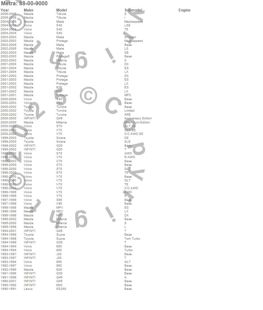 626, 850, 929, 960, C70, ES250, G20, J30, M30, Miata, Millenia, MPV, Protege, Protege5, Q45, S40, S70, S90, Solara, Supra more…