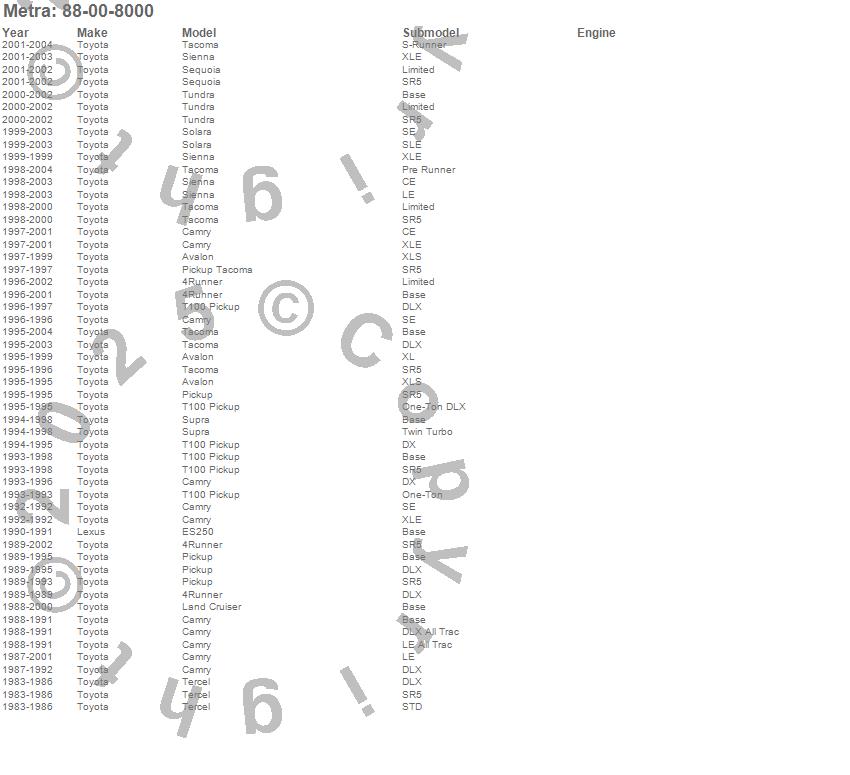 4Runner, Avalon, Camry, ES250, Land Cruiser, Pickup, Sequoia, Sienna, Solara, Supra, T100, T100 Pickup, Tacoma, Tercel, Tundra, Lexus, Toyota, 2004, 2003, 2002 more…