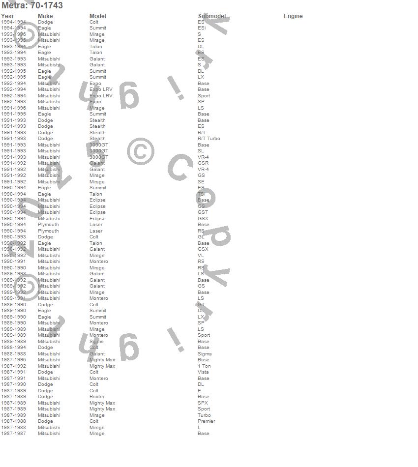 3000GT, Colt, Eclipse, Expo, Expo LRV, Galant, Laser, Mighty Max, Mirage, Montero, Raider, Sigma, Stealth, Summit, Talon, Dodge, Eagle, Mitsubishi, Plymouth, 1996 more…