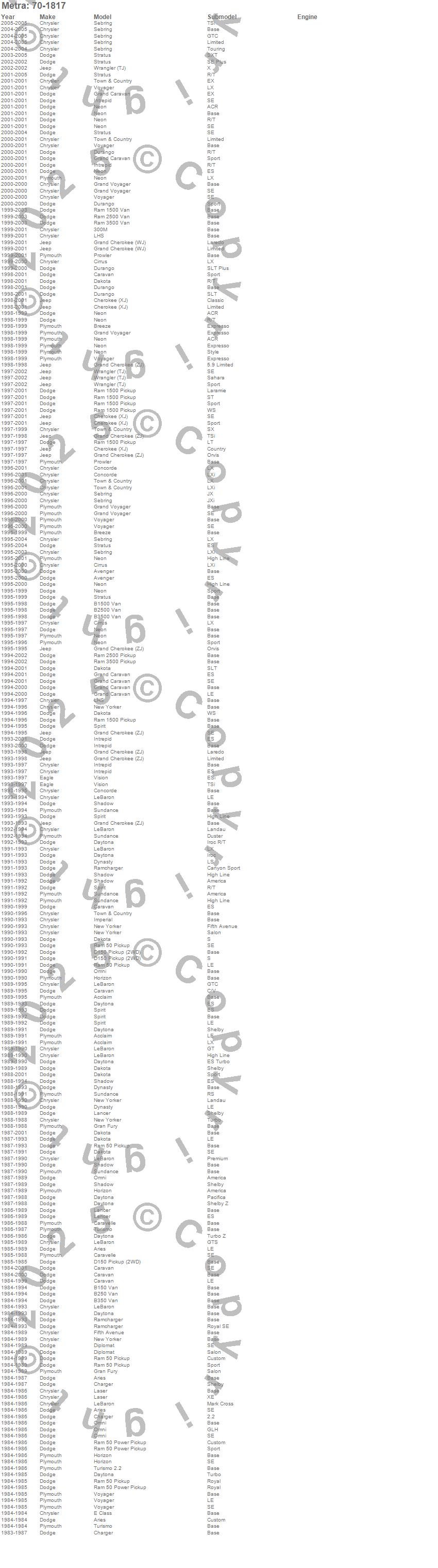 300M, Acclaim, Aries, Avenger, B150, B150 Van, B1500, B250, B250 Van, B2500, B350, B350 Van, B3500, Breeze, Caravan, Caravelle, Charger, Cherokee, Cherokee (XJ), Cirrus more…