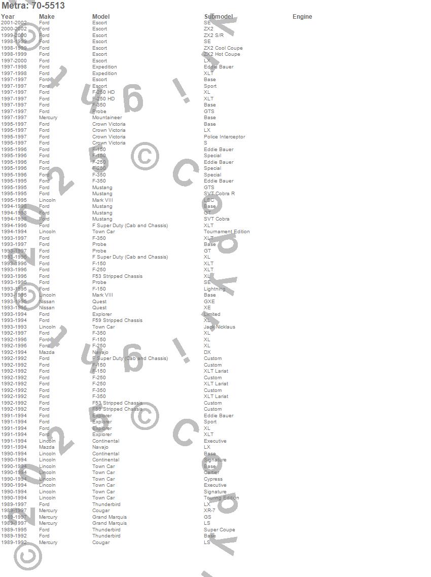 Continental, Cougar, Crown Victoria, Escort, Expedition, Explorer, F Super Duty, F-150, F-250, F-350, F53, F59, Grand Marquis, Mark VIII, Mountaineer, Mustang, Navajo, Probe, Quest, Thunderbird more…