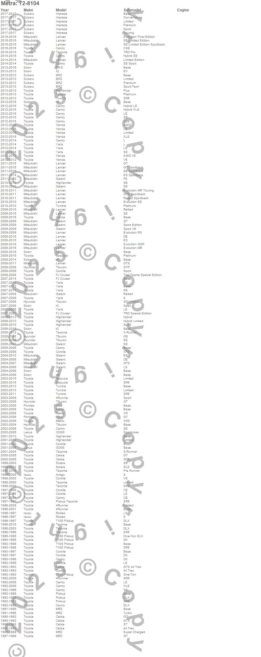 4Runner, Camry, Celica, Corolla, Highlander, Matrix, MR2, Pickup, Sequoia, Solara, T100, T100 Pickup, Tacoma, tC, Tundra, Venza, xA, xB, xD, Yaris more…