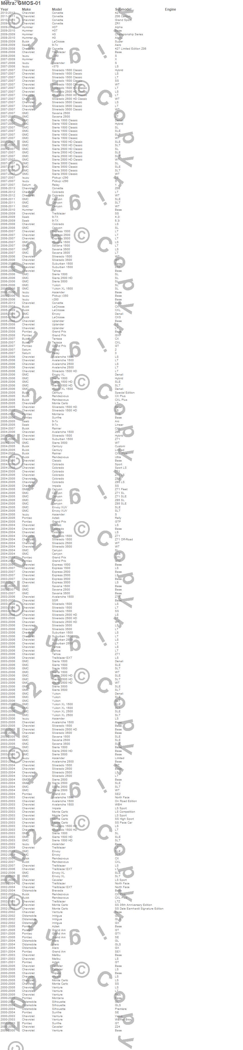 9-7X, Alero, Ascender, Avalanche 1500, Avalanche 2500, Aztek, Bravada, Canyon, Cavalier, Century, Classic, Colorado, Corvette, Envoy, Envoy XL, Envoy XUV, Express 1500, Express 2500, Express 3500, Grand Am more…