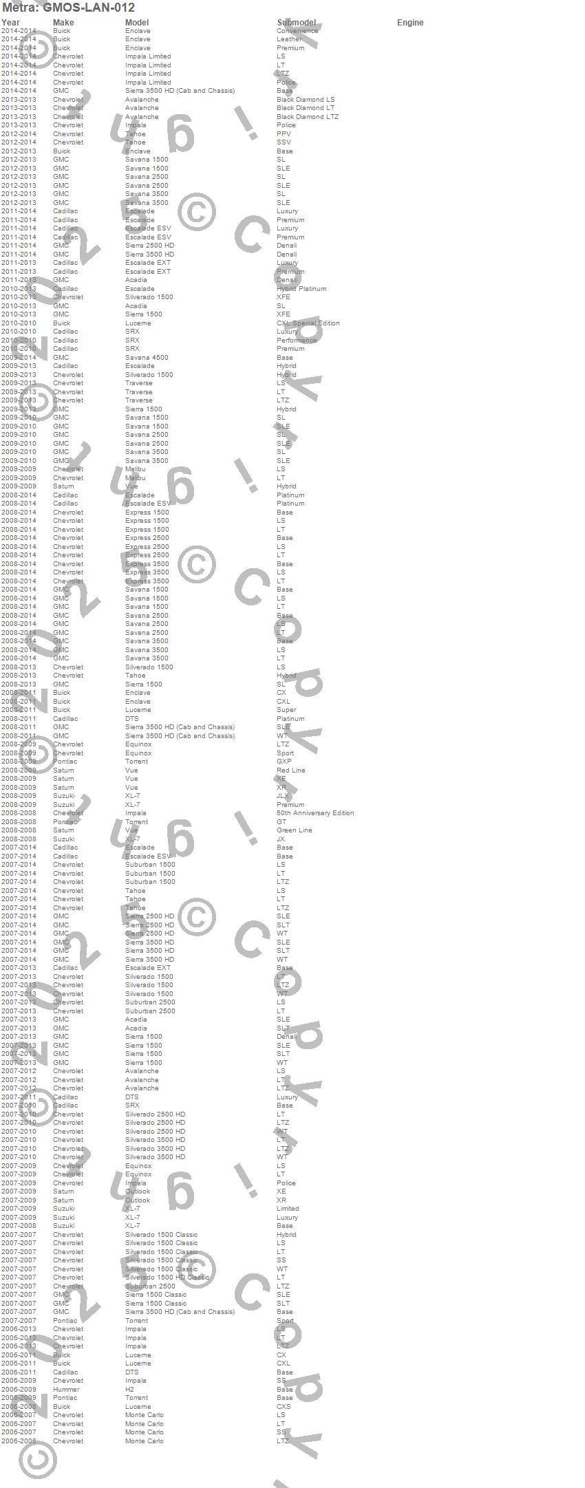 Acadia, Avalanche, DTS, Enclave, Equinox, Escalade, Escalade ESV, Escalade EXT, Express 1500, Express 2500, Express 3500, Impala, Lucerne, Malibu, Monte Carlo, Savana 1500, Sierra 1500, Sierra 2500 HD, Sierra 3500, Sierra 3500 HD more…