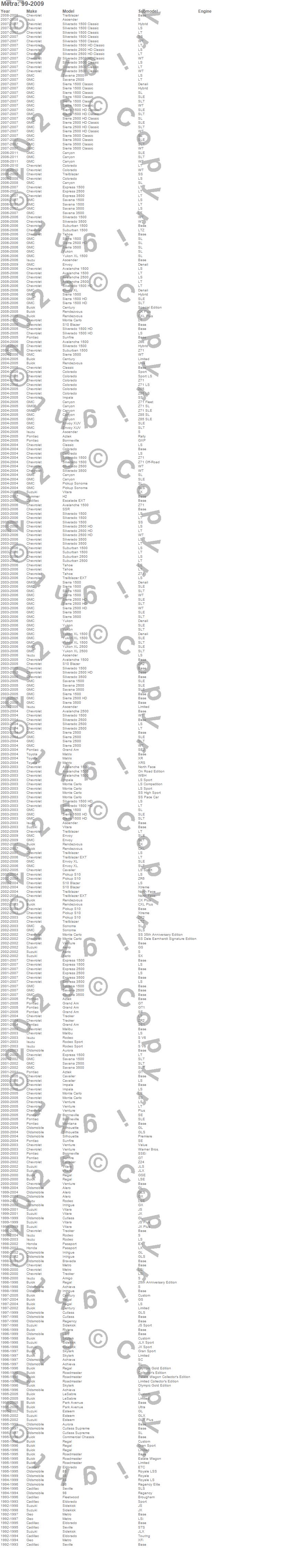 88, 98, Achieva, Aerio, Alero, Amigo, Ascender, Aurora, Avalanche 1500, Avalanche 2500, Aztek, Bonneville, Bravada, Canyon, Cavalier, Century, Classic, Colorado, Commercial Chassis, Cutlass more…