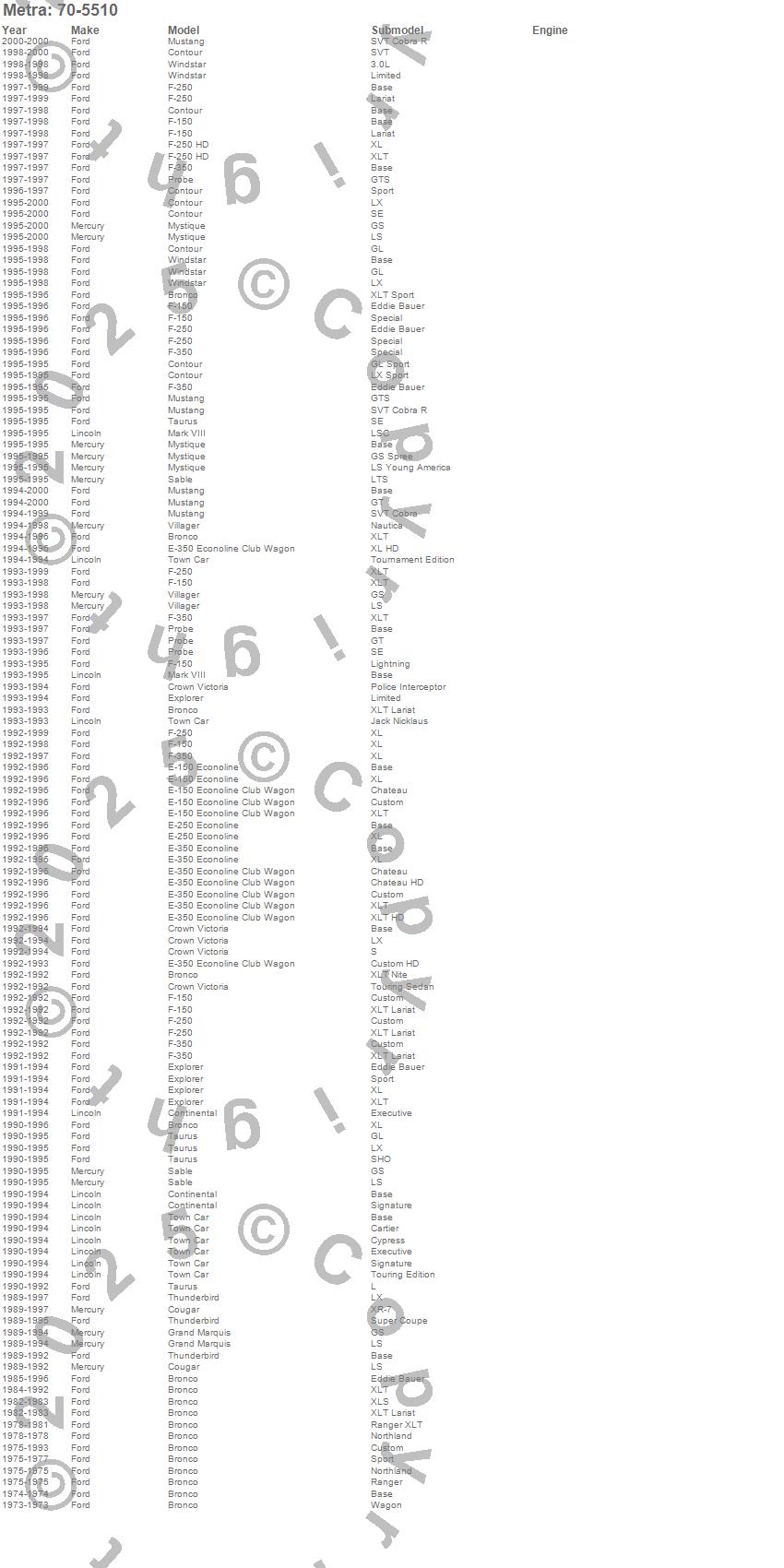 Bronco, Continental, Contour, Cougar, Crown Victoria, E-150 Econoline, E-150 Econoline Club Wagon, E-250 Econoline, E-350 Econoline, E-350 Econoline Club Wagon, Explorer, F-150, F-250, F-350, Grand Marquis, Mark VIII, Mustang, Mystique, Probe, Sable more…